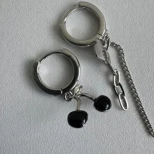 925 Silver Black Cherry & Heart Chain Hoop Earrings