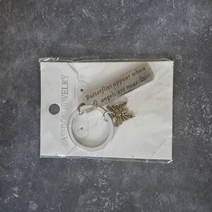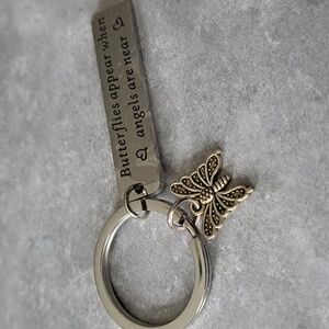 Silvertone keychain featuring a butterfly charm and engraved tag. Perfect as a gift or a sweet reminder to yourself. New in Package.