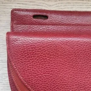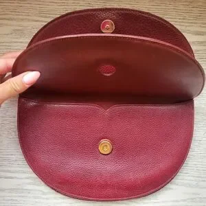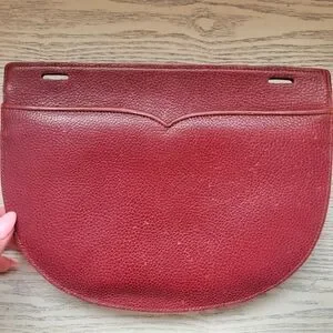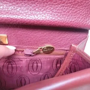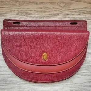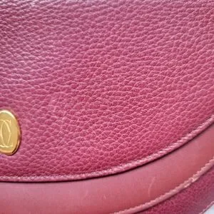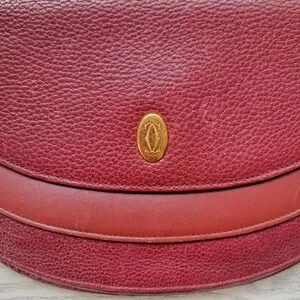 Authentic Vintage Cartier Double Flap Crossbody Bag in good/fair condition. Minor signs of wear on front (some scratches and edge wear). The back of the bag has some textured nicks. Interior has a satin-like material in good condition. Some hardware scratches. Double flap with magnetic closure with 1 exterior pocket. This crossbody is missing the strap. Could use a good leather conditioner to really bring out the burgundy color! *chain not included.