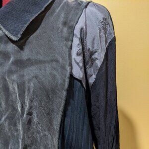 This unique and elegant dark blue Spencer Alexis maxi dress features a stunning patchwork design with a vintage flair. Crafted with attention to texture and detail, this dress includes a soft collared neckline, a full button-down front with shell buttons, and long sleeves. The dress is made from a mix of luxurious, crinkled, and semi-sheer fabrics that add movement and dimension.