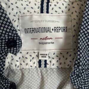International report size medium men’s button down. Navy blue with white circle pattern. Pet free and smoke free home