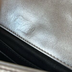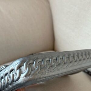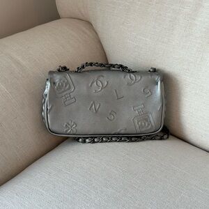 Elegant silver quilted design. Iconic CHANEL logo. Chain strap detail.