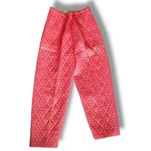 Vintage 1960s quilted satin pajama set in bubblegum pink with lace trim details. Set includes a long sleeve quilted tunic top with pearlized buttons, tie waist, and floral lace edging plus matching high rise pants with elastic waistband. Soft, shiny, and cozy—perfect as retro loungewear, vintage sleepwear, or styled as a statement two piece set. Tag size 34, best fits a modern Medium. See measurements for accurate fit.