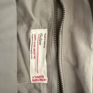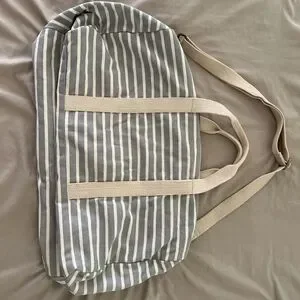 Stylish and ethical duffel bag by Known Supply, handmade in India. Features gray and white stripes, dual handles, adjustable shoulder strap, and zippered pockets. Spacious design makes it perfect as a gym bag, diaper bag, carry-on, or overnight weekender.