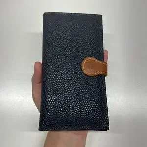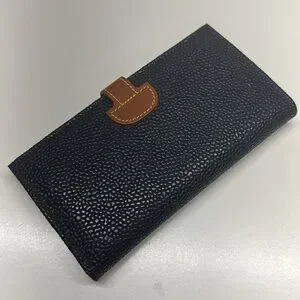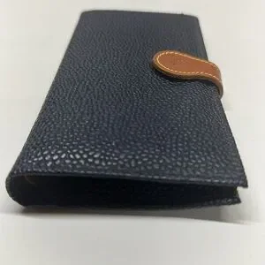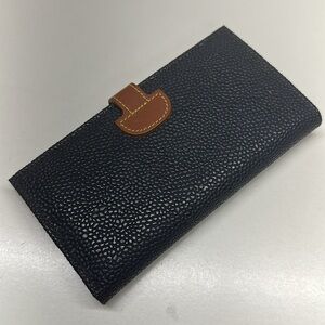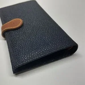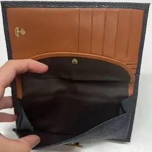 Made from navy blue caviar or textured leather, it's trimmed in smooth tan leather and plaid fabric inside with one long snap pouch, 5 card slots and three slip pockets.