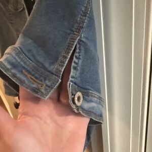 No brand cropped, short sleeve denim jacket. Jacket has stretch. Adorable piece.