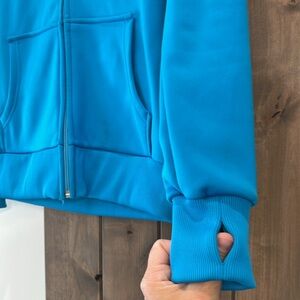 Hooded Blue Dryride zip up with “Burton” across front in white stitching. Two pockets in front, left one has an inner pocket with Velcro close and headphone chord hole. 100% polyester material. Light fleece lined on inside. Excellent condition, only worn once. Size adult small.
