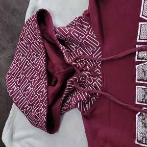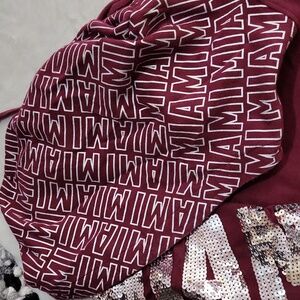 Chic burgundy sweater with bold Miami and PINK sequin. Hooded design for added style. Says Miami on hood and down both sleeves.