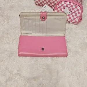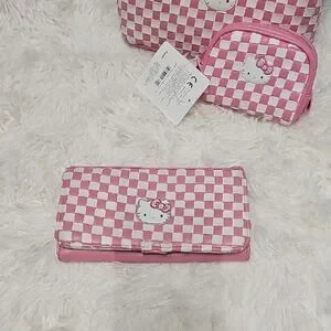 This is a vintage Hello Kitty Sanrio Bag from the 2007 collection. The wallet features a checkered pattern in classic Hello Kitty pink and white with appliqued Hello Kitty face and her iconic bow, making it a special Limited Edition .