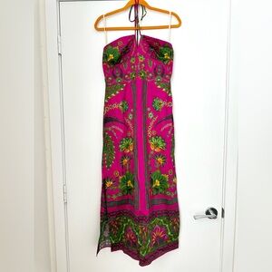 Embrace charm with Ana Tapestry Strapless Midi Dress, where romance meets boho flair. This garment's halter neckline leads to a heart-shaped bodice, complemented by a tapestry of vibrant, lush patterns that dance across a vivid pink canvas.