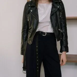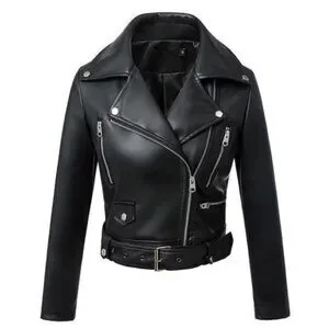 Black faux leather jacket with collar and belt