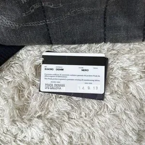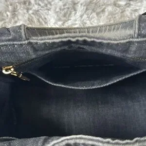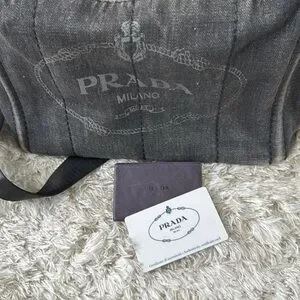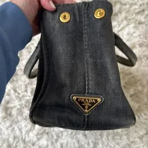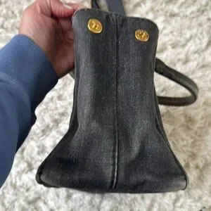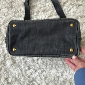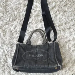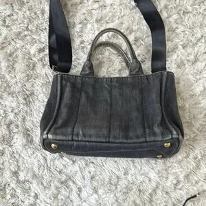 Chic Prada bag in charcoal denim. Features sturdy handles and a sleek (non-branded) adjustable strap.