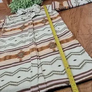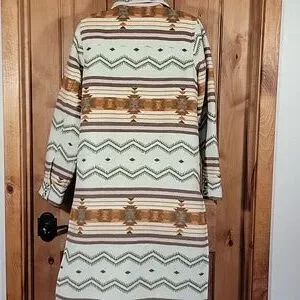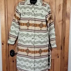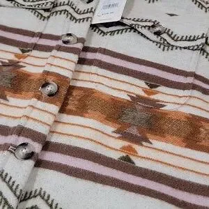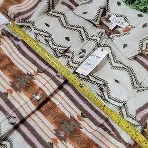 Cozy soft fleece with earth tone colors and a native southwestern pattern. Two front pockets and vented hemline for comfortable sitting. A great weight for fall to winter transitions. Oversized XS and measurements are in the photos. Excellent new with tag condition.