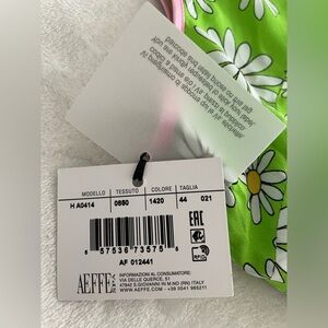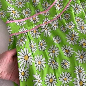 The combination of the pop daisy print and lime green makes you feel happy just by looking at it. The pink lines on the top and around the waist are also cute. Pair it with chunky sandals for a 70s retro pop look. Lined. Back zipper closure. Pockets.