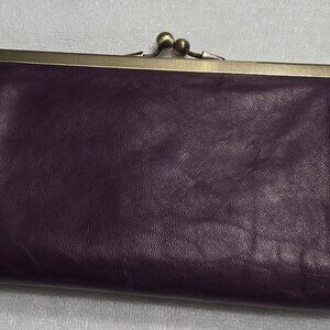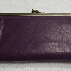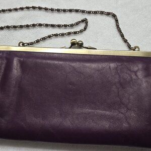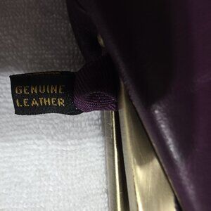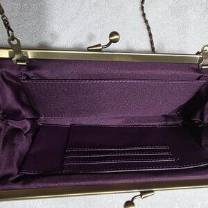 Purple leather clutch purse (No brand name) with brass metal lining on the Ball snap and Chain-link brass chain which can be used as a shoulder strap. Nice deep purple color with purple lining inside for your full-size phone, credit cards or lipstick.