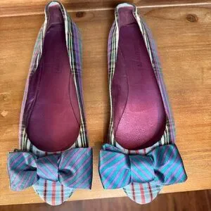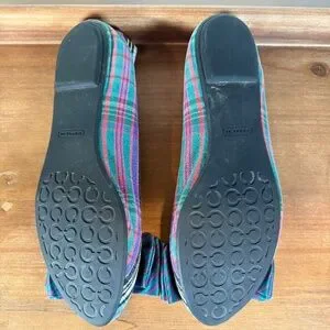 Coach Cambria Poppy Bow Plaid Tartan Flats in Green, Purple, Yellow, Orange, and Black colors Perfect for the next holiday party or to dress up some jeans! These are in good worn condition with plenty of life left in them