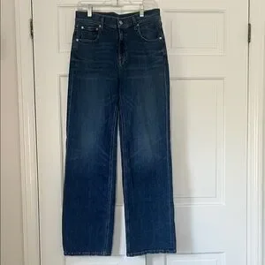 Stylish dark blue flare jeans by AYR. Comfortable and versatile for any wardrobe. Wide leg fit. Regular length.