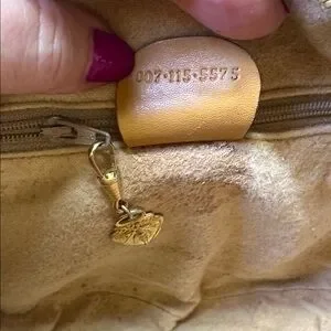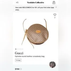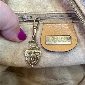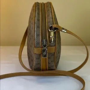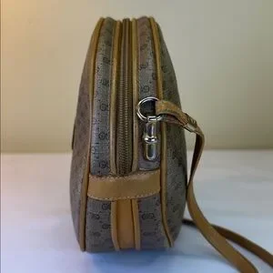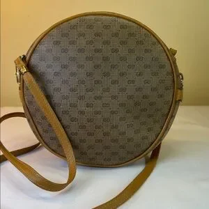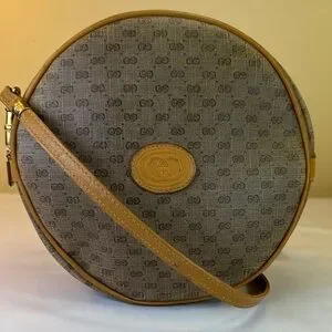Gucci Monogram RARE Small GG logo bag in coated canvas and leather in unique round shape. Made in Italy. Crossbody length leather strap and the bag will fit your phone and more. Leather piping and trim is intact. Goldtone hardware. Has the famous vintage Gucci zipper pull inside that is removable if you want to use on a necklace as a charm. Zip top closure opens to tan fabric interior with one zip pocket. 8” diameter bag is very versatile. Cleaned and conditioned. Minor darkening on some areas of leather from age. Listed on Vestaire for $780!