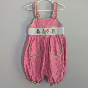 Girls Cukes Frog Polka Dot Jumpsuit 4T Pink Green Smocked