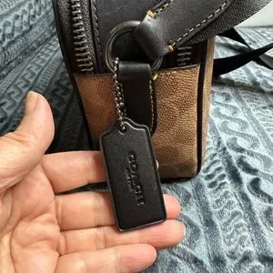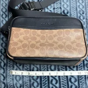 Elegant Coach crossbody bag in black and tan. Features signature pattern. Ideal for everyday use.