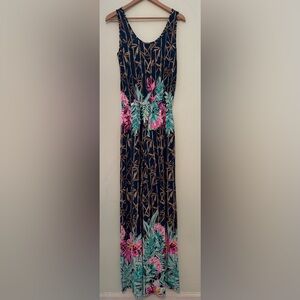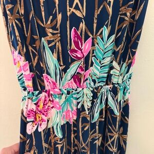 Lilly Pulitzer Kori Jumpsuit, women’s size small. Sleeveless style with wide leg bottom. Elastic waist. Unlined. Tropical floral bamboo print. Material has some stretch. In very good used condition. Please message for any questions.