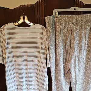 Comfortable matching set with a striped top and patterned, tie waist pants. Perfect for relaxation or casual outing. Great used condition.