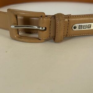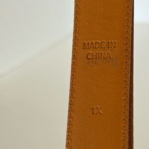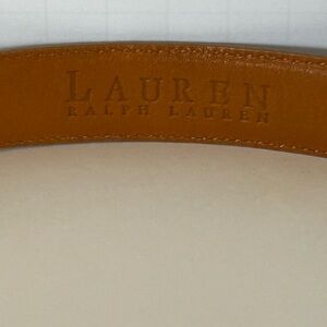 Elegant tan leather belt with leather covered metal buckle. Signature Lauren Ralph Lauren style. The belt is a size 1x . It measures 1” in width and is 43.5” from tip of buckle to the end. There is rub and indentations to the leather on the buckle. Please view the photos as it is visible on the close up.