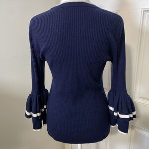 FRAME Double Ruffle-Cuff Rib-Knit Wool Sweater Navy Blue Supersoft Size Small