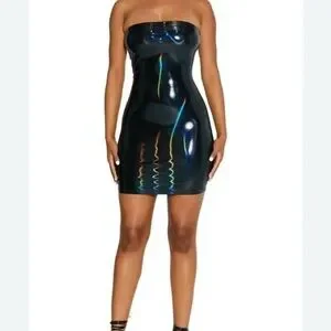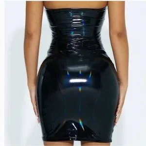 Sleek strapless design. Shiny black finish. Perfect for a night out.
