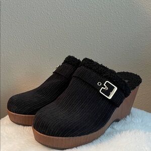 Experience comfort with these stylish black mules. Features a cozy lining and chic buckle. Warm and cozy wedge open heal slides, mules. Perfect for casual wear.