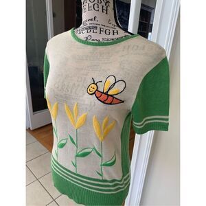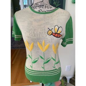 Vintage embroidered bumblebee cardigan featuring colorful garden motif in soft, machine washable acrylic. With lovely embroidered yellow spring flowers. Short sleeves and a green back. Size small. It is a one of a kind piece. Pit to pit is 16 inches and length shoulder to hem is 21.5 inches