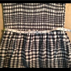 "Adorable navy and white checkered gingham pattern picnic dress! Excellent condition, no size or brand tag, measurements added, straps are adjustable, top is very stretchy, I am a 38 E and fit totally fine! There was also enough stretch in the waist for me at a 16 to fit comfortably, I would say anyone between a size M and 1x can wear this dress! It's very dark I first thought it was black, only under certain lighting can u really see it's navy, add a jean jacket and boots for fall!"