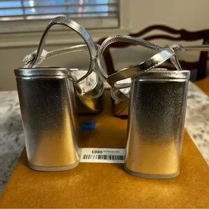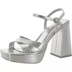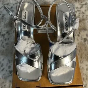 New Silver Steve Madden Platform Cross-Strap Sandals, Crazy Heels, sz 6