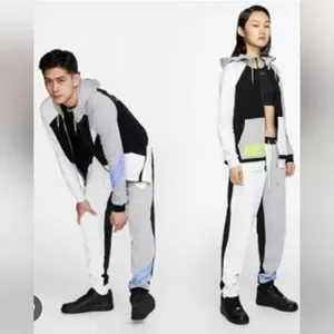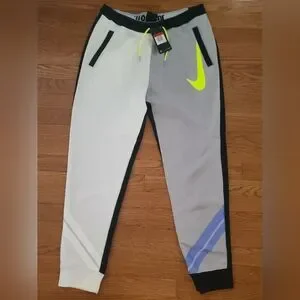 Stylish and comfortable, these Nike women's joggers feature a trendy colorblock design in white, gray, and black with neon accents. Perfect for active days, they offer a standard fit with an elastic waistband and cuffed ankles. Zipper pockets.