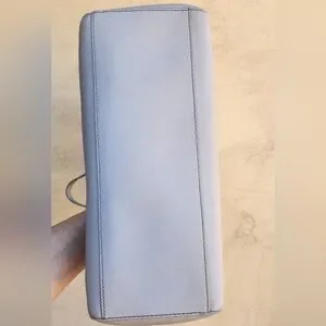 Elegant and durable, this tote is crafted from scratch-resistant saffiano leather and features double adjustable buckled handles, an open top, front logo plaque, silver hardware, a hanging zip pocket with four inside slip pockets, a small side zip pocket, and a handy key clip. In good used condition, one small interior stain and a barely noticeable micro stain on the outside. Still lots of life left. Measures approximately 9" x 15" and includes original dust bag.
