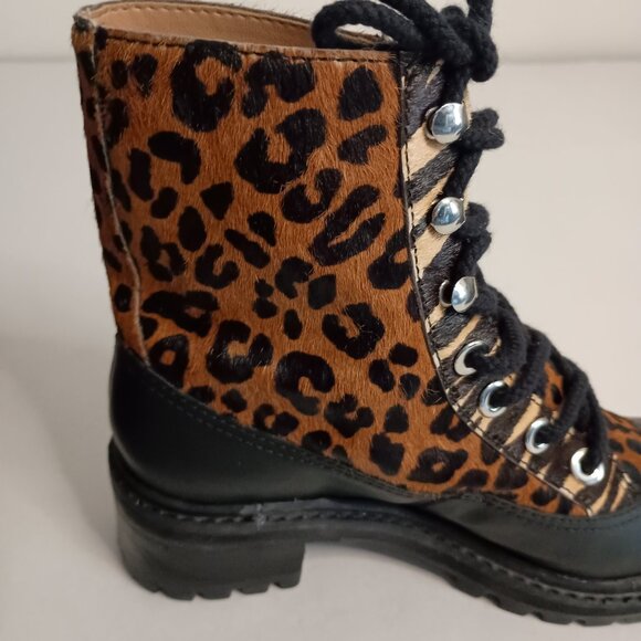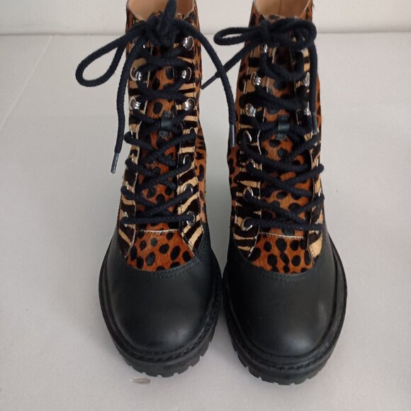 Schutz Mafalda Leopard Print Leather Calf Hair Lug Sole Tie Ankle Boots Women’s Size 6B