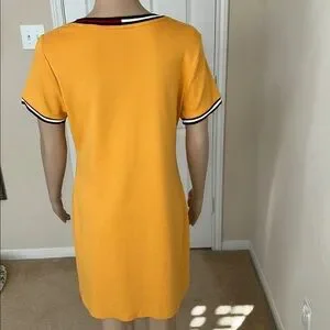 Chic mustard dress with V-neckline. Black and white trim accents. Iconic logo on chest.