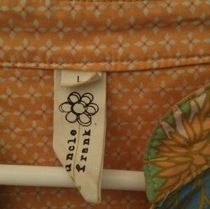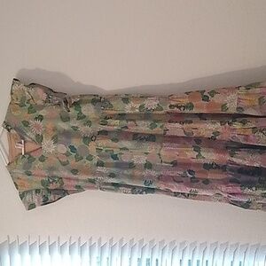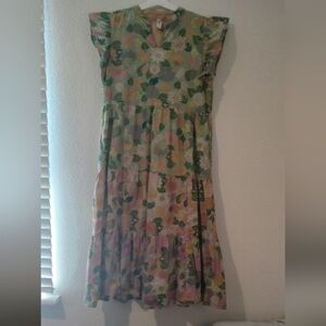 Charming floral midi dress with green and orange tones. Features a tiered design and flutter sleeves. Perfect for casual outings. 3 tier levels, last tier oversized for a full look. Beautiful pink,green, yellow, liliac,white. Unlined. Oversized pockets. Lining in orange print in bodice. V neck, slip on, no zippers. Noted to the inside lining back vague marking in black. See photo.