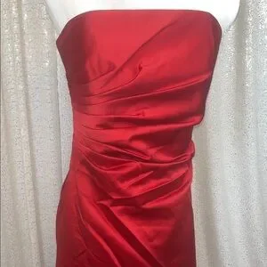 Beautiful red satin ruched formal gown from A.B.S. Evening Allen Schwartz. Perfect for holidays or bridesmaid look.