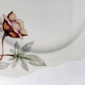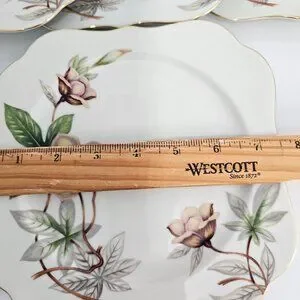 These vintage-inspired blue luncheon plates feature a beautiful Woodrose pattern, perfect for any retro-themed gathering. Made in Japan by Meito, each 7.5" plate is adorned with a gold scalloped edge, blending elegance with a nostalgic touch. Ideal for serving salads or light meals.