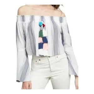 Boho and breezy, this ANTHROPOLOGIE LILKA Playa peasant crop top features white with gray stripes, an off-the-shoulder neckline, and playful pom pom tassel ties at the front. Finished with flowy bell sleeves, itβs the perfect festival-ready or casual summer piece.