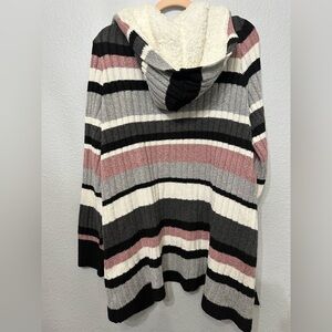 Chic striped cardigan with a cozy hood. Features black, gray, pink, and white stripes. Perfect for layering and casual wear.