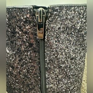 These silver heeled boots feature a dazzling metallic sparkle finish, perfect for glamorous nights out. With a sleek pointed toe and a medium-height stiletto heel.