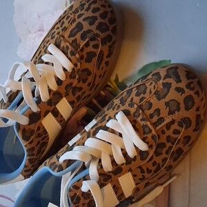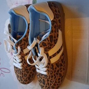 New woman's casual sneakers, "kory" animal print; leopard and blue accent sneaker shoes
