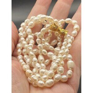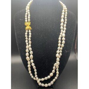 Freshwater Rice Pearl Necklace 2 Strand Hand Knotted 19" Gold Tone Floral Clasp
