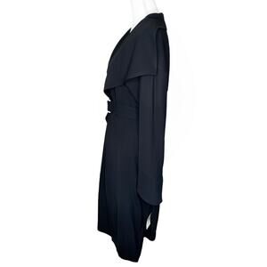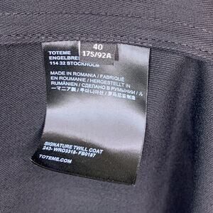 Totême Women's Signature Flowing Twill Trench Coat Black Pre-Fall '24. With its signature clean lines and minimalist style, Stockholm-based Totême is the quintessential Scandi-cool modern uniform using vintage pieces for inspiration. Crafted from twill, this signature trench coat features a detachable waist belt, wide draped lapels, open front, long sleeves with split cuffs, two side slit pockets, central rear vent, straight hem, mid-length. All photos except for 1-3 and modeled shots are of the actual item. Size FR 40 (equivalent to US 8). New with tags. 98% viscose, 2% elastane. Length 45"-49". This style currently retails for $1280 in this size. As of listing this is the only size FR 40 available on the resale market. Guaranteed authentic.