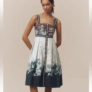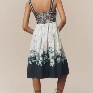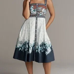 Anthropology - Maeve- Chic midi dress with floral patterns. Features blue and white hues. Ideal for stylish outings.