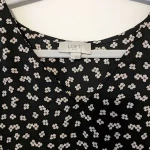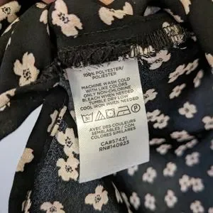 Chic black top with white floral pattern. Features short sleeves and a relaxed fit. Perfect for casual outings.