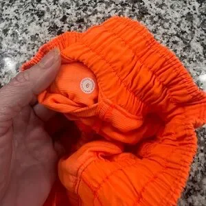 Vivid orange shorts with a comfortable fit. Ideal for active wear. Features elastic waistband.