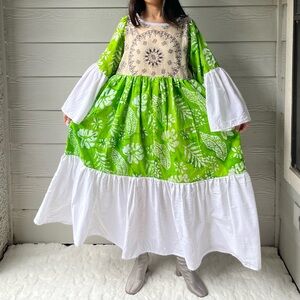 The dress is handcrafted from upcycled pure white organic cotton sheets, deadstock green leaves printed handkerchiefs, and cotton bandanas.